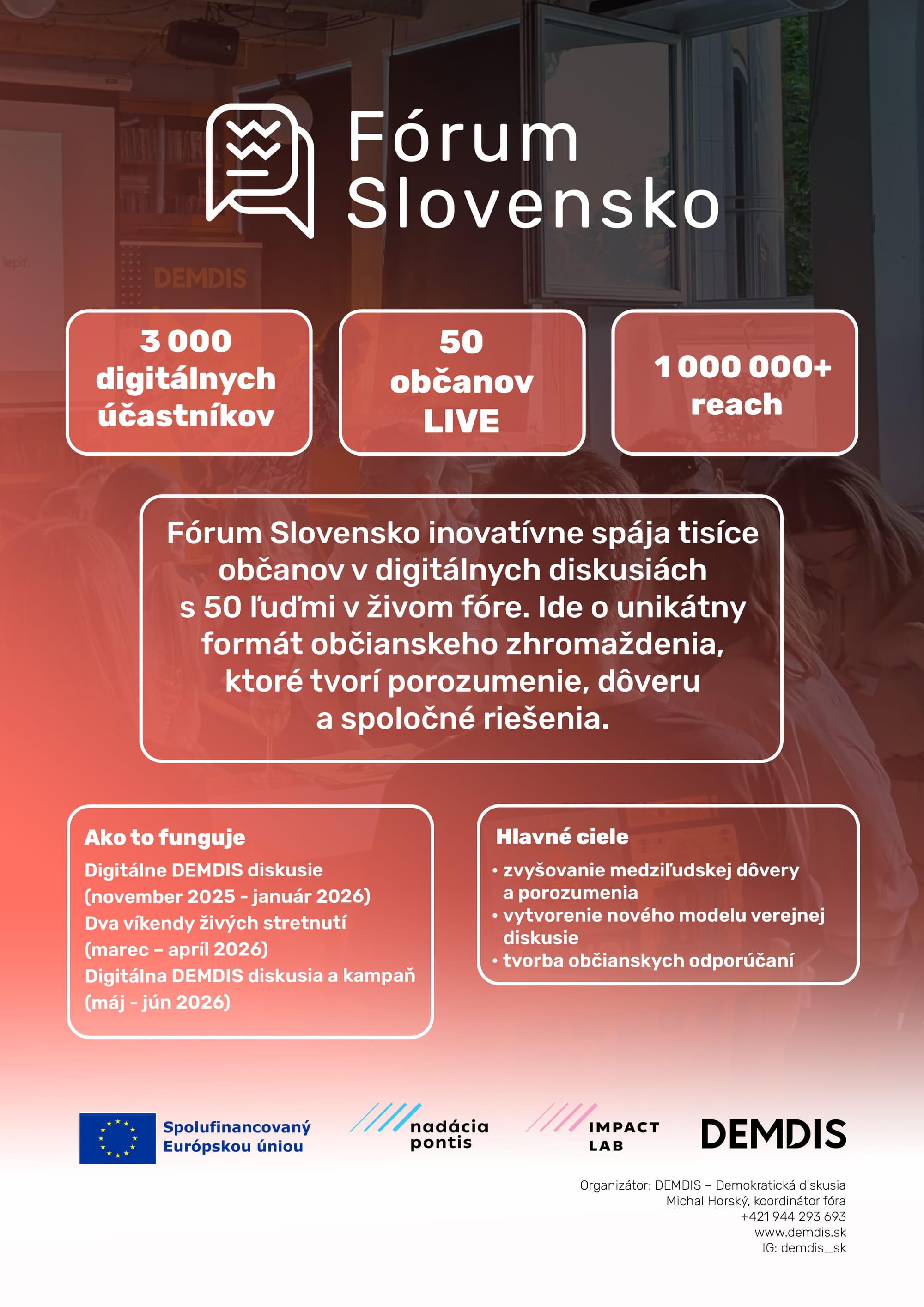 Fórum Slovensko je jedinečný formát občianskeho fóra, ktorý spája inovatívne digitálne DEMDIS diskusie so živými stretnutiami 50 občanov - pestrej miniverejnosti z celého Slovenska.